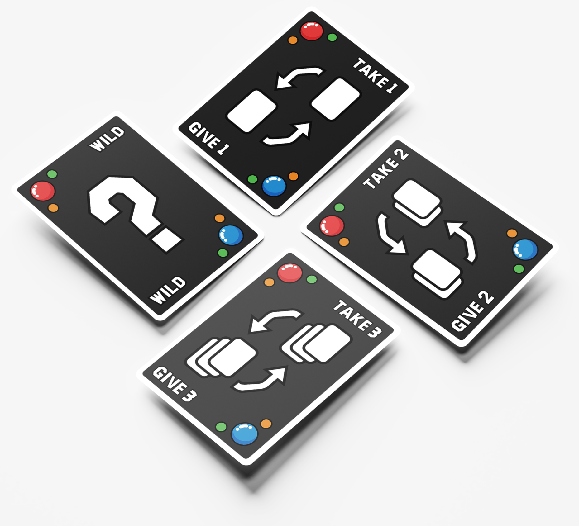 Shuffle and deal 10 cards to each player, then place the rest as a draw pile. Inside the box are 112 cards: 100 letter cards in 5 colors, 6 wildcards, and 6 Give & Take cards.