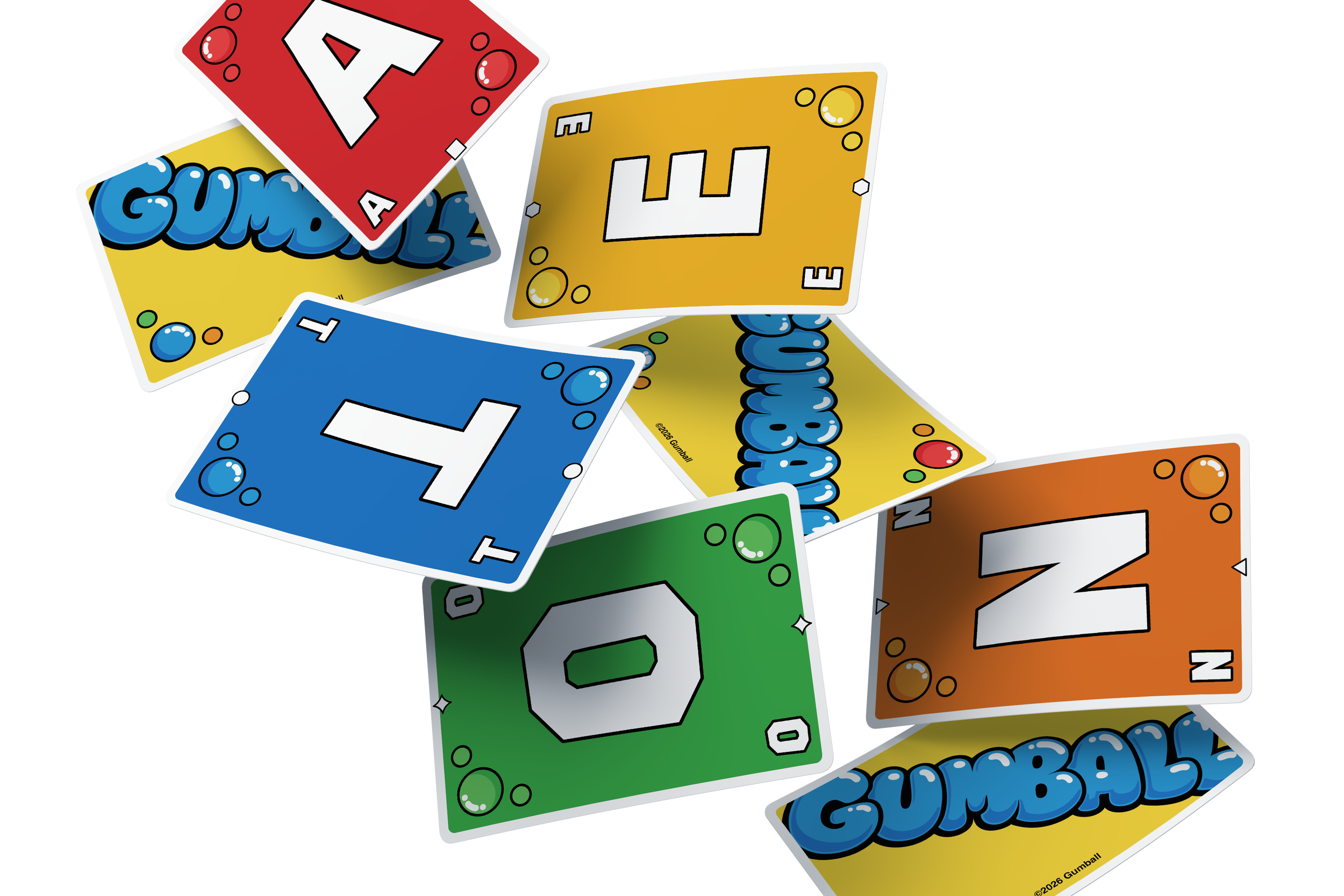 • Gumball is a fast, strategic word card game where players race to empty their hands by spelling words, using action cards, and triggering bonus effects.